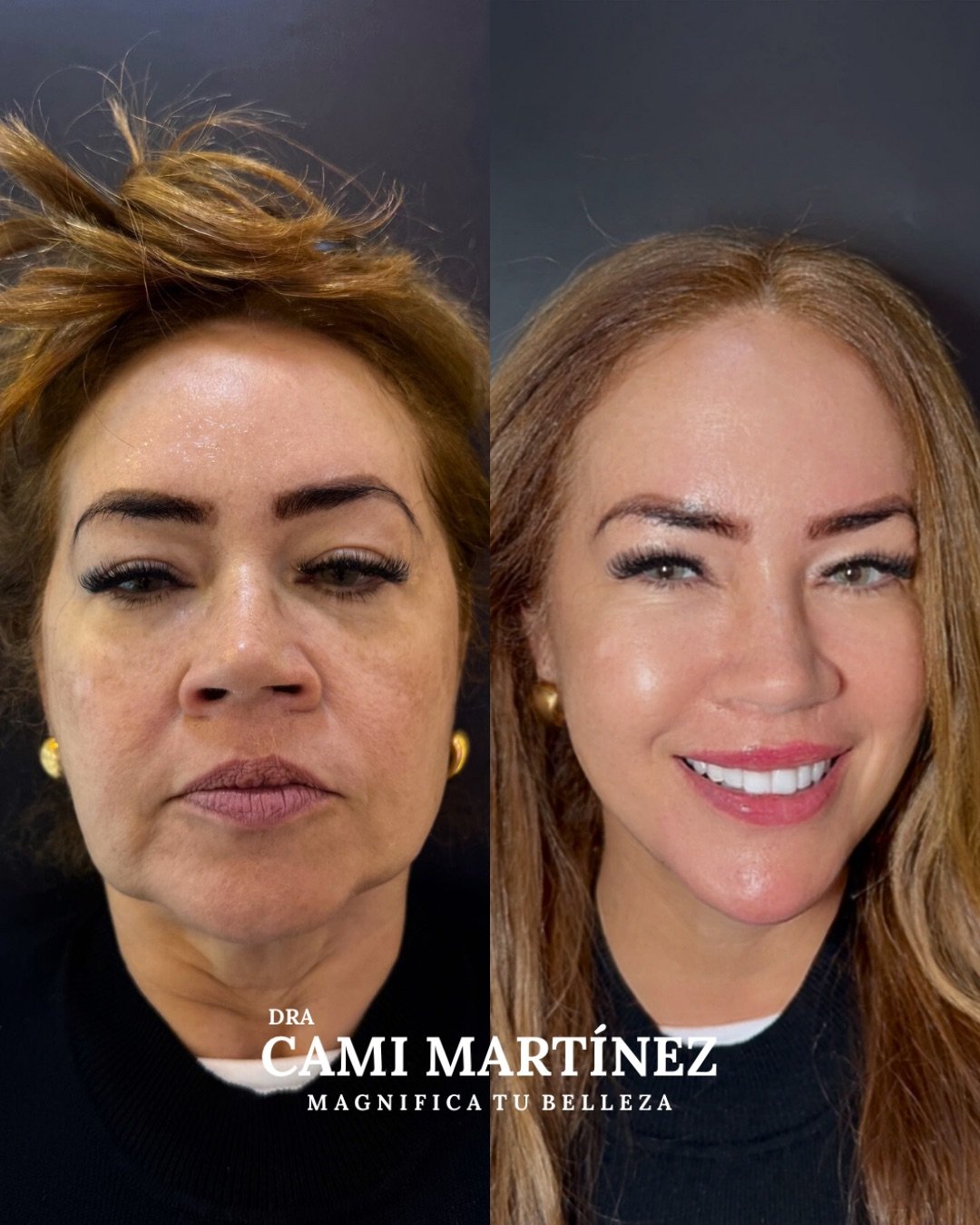 La técnica insignia de la Dra. Cami Martínez integra toxina botulínica, ácido hialurónico, hilos tensores y bioestimuladores para rejuvenecer y armonizar el rostro de forma natural. Realza rasgos como pómulos, labios y mandíbula sin alterar la expresión, ofreciendo resultados personalizados y equilibrados para cada paciente, logrando una mejora natural y armónica.